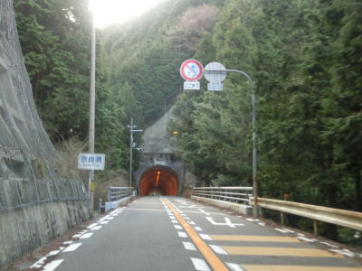 | 石見川集落を通り過ぎると勾配が多少きつくなり、それ以上に変化するのはカーブである。ヘアピンカーブを含む急カーブが増えるうえに緩やかなカーブも増えるので見通しは良くない。保護された法面が多いが、R310の府県境区間が土砂崩れ等で通行止になるという話はあまり聞かないので、崩落の後の復旧というよりは崩落を防ぐために事前に行っているものと思われる。 行者橋を渡った先で金剛トンネルに入る。奈良県の県境標識が橋の手前に設置されているが、県境は橋(石見川)ではなくトンネルの中ほどにある。 |