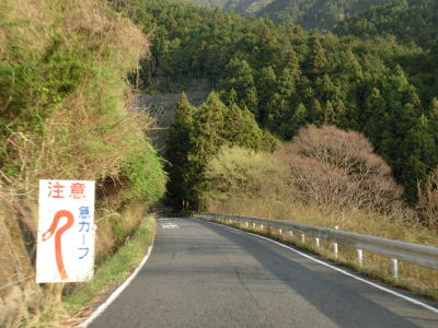 | ヘアピンカーブに注意を促す看板が立っている手前でセンターラインがなくなり道幅が狭くなる。その後すぐに右のヘアピンカーブを曲がるが、カーブ部分は広いので容易に曲がる事ができるが、カーブが終わると1.8車線幅とやや狭い。ヘアピンカーブの奥に砂防ダムが見えているが、カーブ部分で西川を渡る事なくカーブの前も後も西川の右岸を走っている。ヘアピンカーブ部分に接続している市道(林道?)があるが、そちらは西川を渡っており、道幅は狭いながらも沿線に集落が存在している。 | ||