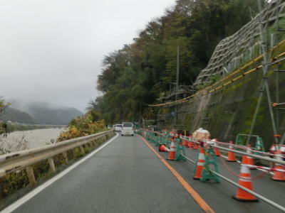 | 岡山r300交差点を通過して少し走った所で法面改修工事のため片側交互通行規制が敷かれていた。工事箇所を過ぎると沿線の建物が増えてきて、商業施設も見られるようになる。岡山r35日名口交差点付近まで沿線の建物が多い状態が続く。 | ||