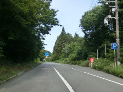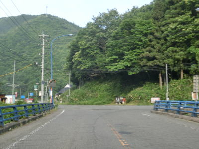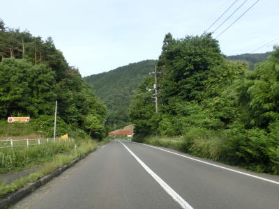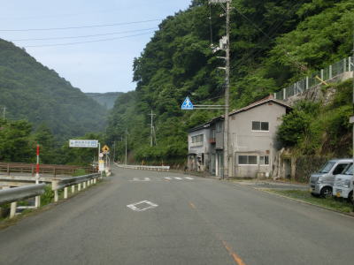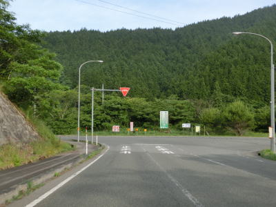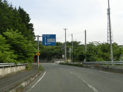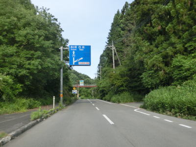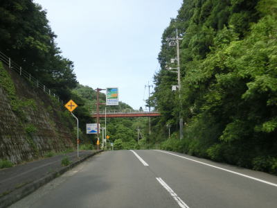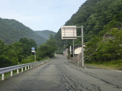 | 広島r444交差点との交差点を通過するが、案内標識の「大型車通行困難」の文字を見るまでもなく、普通車でも入るのと躊躇いそうな状況である。r444交差点を通過したすぐに峠を越えて旧西城町に入る。この名称も付けられていない峠は中央分水嶺であり、南の旧東城町側は高梁川水系で瀬戸内海に、北の西城町側は江の川水系で日本海に流れていく。 | ||