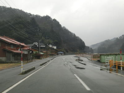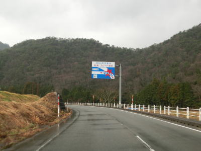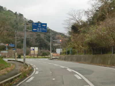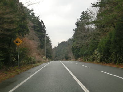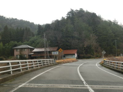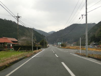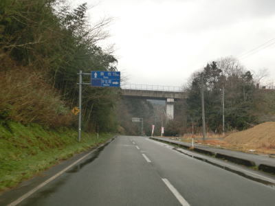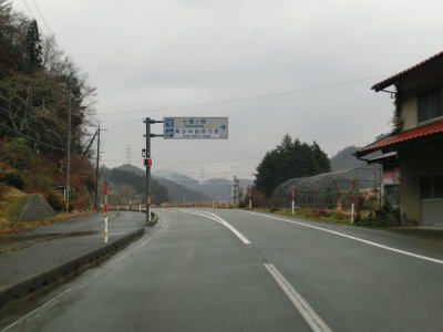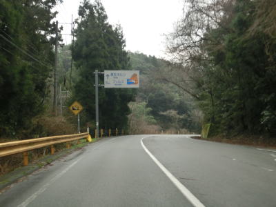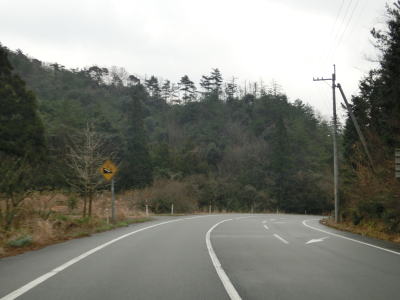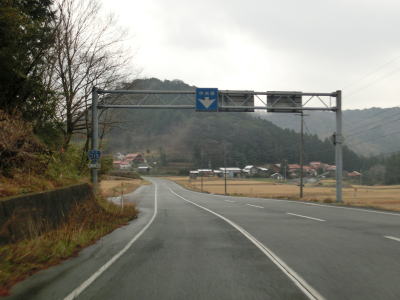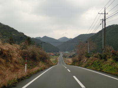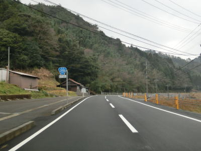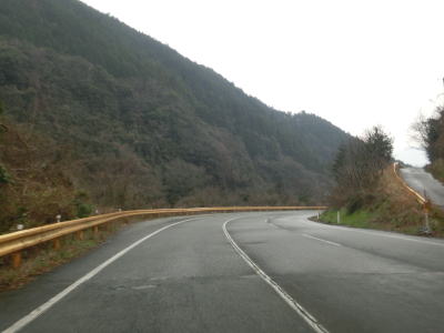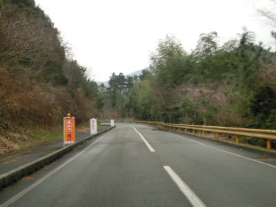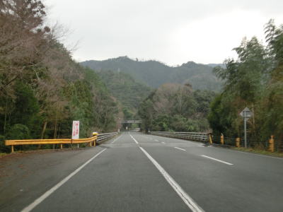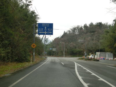 | 小川方面に向かう市道との交差点を過ぎると上り勾配となり、田万川の谷筋を走る。閉鎖された旧道との交差点を通過した直後に金谷山トンネルをくぐる。トンネルを出ると反対車線には登坂車線が設置された3車線道路を下る。大きく右にカーブしていると旧道との交差点を通過するが、こちらも簡易的とは言え閉鎖されている。 | ||
