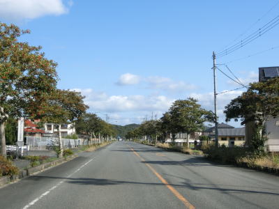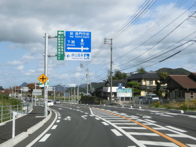 | 街路樹のある2車線道路を走っていると右カーブを曲がって観月橋を渡る。緩やかな左カーブを曲がった先でR191・山口r56正明市交差点に至る。直進してr56を少し走ると長門市役所があり、長門市の市街地と言える場所である。 | ||