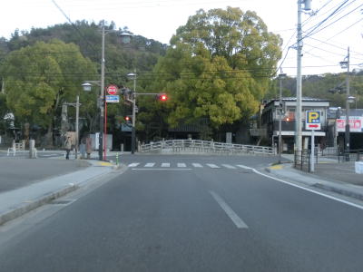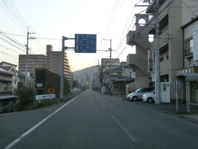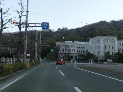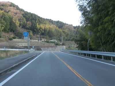 | 松山市役所の西のその名も松山市役所前交差点がR317の起点である。案内標識にはR11とR56しか表記されていないが、実はR11・R33・R56・R317・R379・R440・R494の合計7本もの国道が交差している。R317はR11・R33・R379・R440・R494と重複しながら路面電車の伊予電鉄とともに北上して市役所前電停を通過する。松山城を見ながら片側2車線道路を200m弱進むと愛媛県庁の南西を右に直角にカーブする。伊予鉄道も同様にカーブしている。 | ||