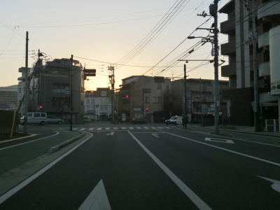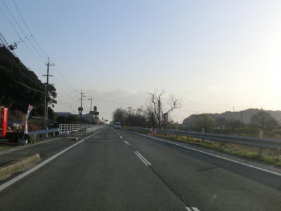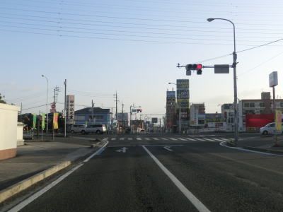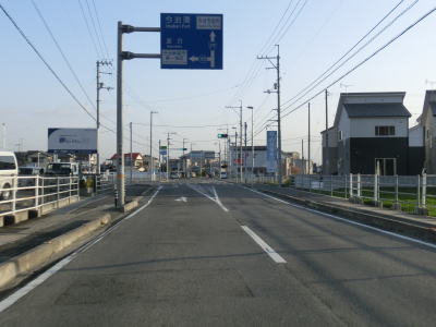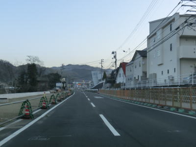 | 堤防から下りて平坦な状態を走っていると愛媛r155と少しだけ重複する。この重複区間の中に今治小松道が通る予定だが、2015年3月時点では辺りで工事をしている様子は見られない。r155重複区間からは沿線の建物も増え、商業施設も目立つようになる。そんな状態を中を走っているとR196片山交差点に至る。R196の起点は松山市にあるが、松山市役所前交差点から約600m西の西堀端交差点である。 | ||