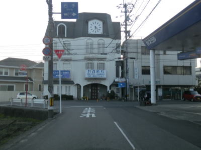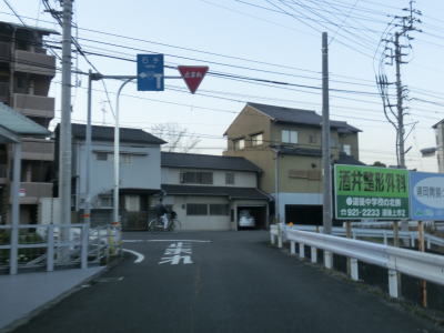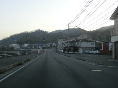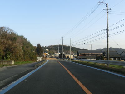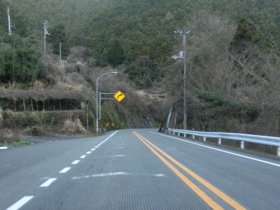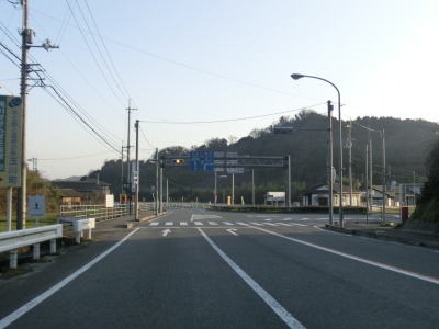 | 勝山交差点から約900m走ると市道との交差点に至る。案内標識に従って交差点を直進すると消えかけたセンターラインの狭い2車線道路となる。そのうえ、100mも進まないうちにT字路に突き当たる。この市道との交差点を一時停止してから右折する。 | ||