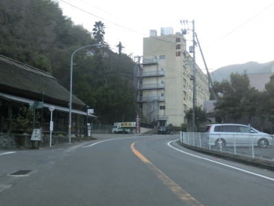 | T字路からはセンターラインのない1.5車線幅とさらに道路グレードが落ちる。家屋に挟まれているせいもあって圧迫感もある。約100m進んで緩やかな勾配を上った所で市道との交差点に突き当たり、今度は左折する。なお、最初の市道との十字路を右折して湯渡橋北詰交差点を左折するというルートであれば普通の2車線道路を走って、この狭路区間をパスする事ができる。 | ||