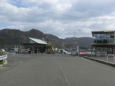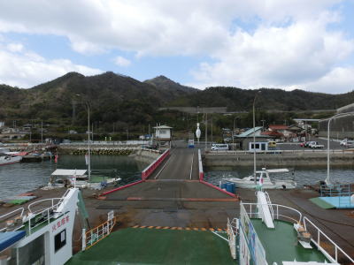 | 赤崎港〜金山港は三光汽船がフェリー便を運航しており、6:50〜19:00の間を時間帯によるがほぼ1時間に3往復と結構な数の便がある。長くても20分待てば乗れるため、西瀬戸道の生口島北IC〜因島南ICを利用せずにフェリーに乗船する事にした。港間距離は約500m、航行時間4分と非常に短い航路で、船のサイズも小さい。乗船方法も窓口に車検証を提示して車両長さを確認してもらって代金を支払うという通常のパターンと異なり、下船車両・者が全て降りてから乗船して乗員に直接代金(普通車・軽自動車で200円)を払うパターンと簡易的である。また、便数は多いものの土日祝日は運航していない。なお、西瀬戸道経由の場合の迂回距離も約4kmと他に比べて短い。 | ||