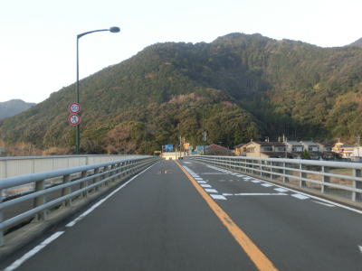 | 川に挟まれた堤防上を走っていると四万十川の遊覧船の乗り場からは中筋川から少し離れて四万十川にだけ沿って走る。本村集落付近ではセンターラインのない2.0車線になってしまうが、見通しも良いので乗用車であれば難なく通行できるだろう。 | ||