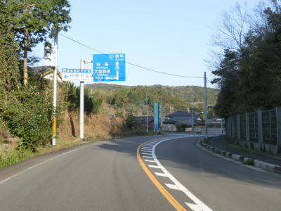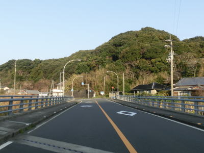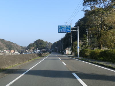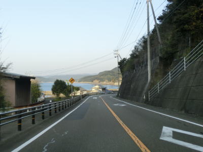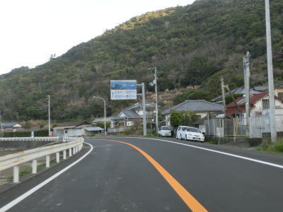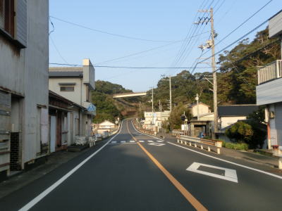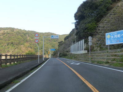 | 大月町に入ってすぐに最初の集落の小才角集落の港湾部を小才角大橋で通過する。その後しばらくは集落のない海岸線部分を走る。足摺サニーロードという標識が立てられているが、水平線を見ながら快走できる場所は意外に少ない。 | ||