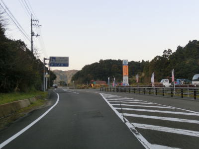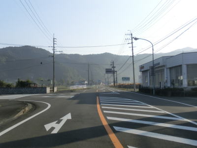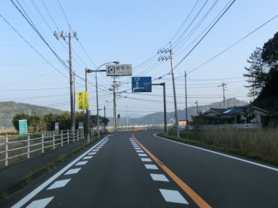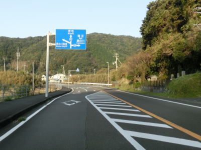 | 緩やかな勾配を下っていると大岐中益野林道との交差点を通過する。前述の通り、土佐清水市の市街地をパスするルートであり、R321の13.1kmに対して林道を走行した場合は6.0kmと半分未満で済む。林道との交差点を過ぎると左にカーブし、益野一の橋と益野二の橋を相次いで渡る。似た名称の橋だが、前者はウシジ川に後者は本流の益野川に架けられた橋である。益野二の橋以降は益野川の右岸の2車線快走路を走る。 | ||