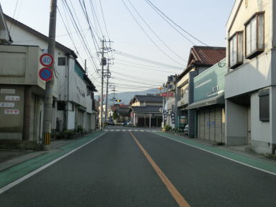 | 大橋交差点からすぐに新大橋を渡るが、その南詰にはおにぎりとともに副楽トンネルに3.6mの制限高が設定されている旨を警告する標識が立てられている。新大橋からは緩やかな上り勾配となって家屋の間を走り抜ける。2007年に廃校になった山田高校の正門前には小型の電光掲示板が設置されており、そこにも制限高に関する注意が表示されていた。原町集落からは上り勾配に加えてカーブが連続するようになる。 | ||