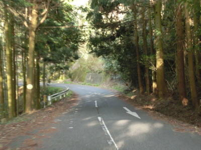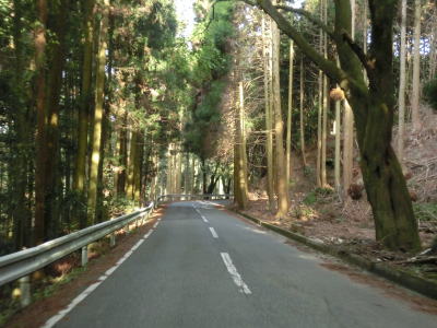 | センターラインがあるとは言え車線幅はさほど広くないうえに急なカーブが多く速度を出す事はできない。場所によっては下界を遠望できるポイントもあるが基本的には眺望は利かない。標高350m程の地点で古処山への登山道まで行ける古処林道との交差点を通過し、なおも緩やかな勾配を下り続ける。 | ||