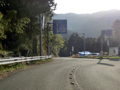 | 千手川を渡った先には小型の電光掲示板と雨量通行規制区間の始点を示す標識が立てられている。標識によると旧八丁峠を含む区間は連続雨量170mm超で通行止になる。ただし、近傍に閉鎖ゲートは設置されておらず、規制時には簡易的なバリケードが置かれる程度かもしれない。 規制区間に入ってからもセンターラインのある2車線道路だが車線幅が若干狭くカーブが多いため、大型トラックの通行には難がある。いくつかのカーブを通過しながら意外に緩やかな上り勾配の道路を走っているとセンターラインがなくなる。とは言え1.8車線程度の道幅があるので乗用車であればさほど苦労する事もなく走行できるだろう。 |