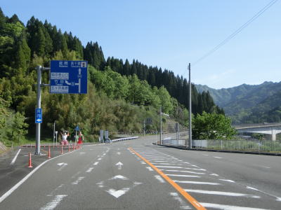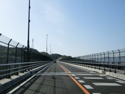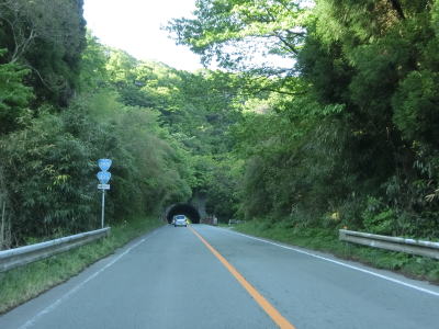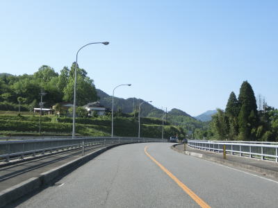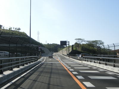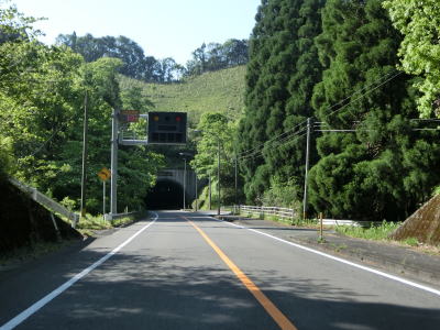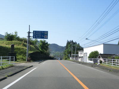 | 河内郷大橋を渡り終えて緩やかな左カーブを曲がっていると旧道らしき町道との交差点を通過する。以降も下り勾配の2車線道路が続いており走りにくさはさほど感じない。勾配が若干急な箇所もあり、上りとなる東向き車線には登坂車線が設置されている。旧道らしき道路との交差点がいくつもあるが沿線に家屋があるせいか閉鎖されていないものも多い。弧を描いている玄武山トンネルをくぐって右の急カーブを曲がると進行方角が東から南に変わる。 | ||