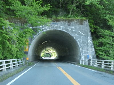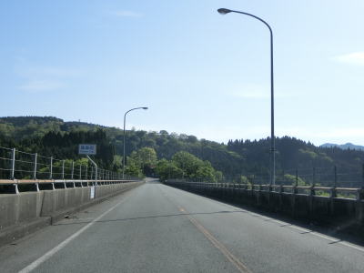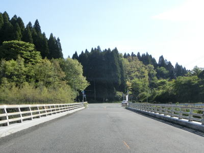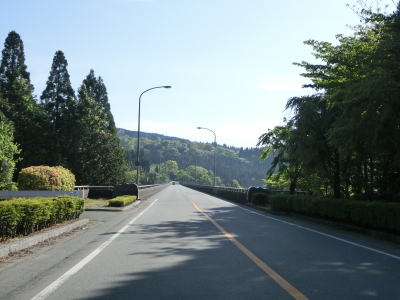 | 急カーブ区間を過ぎた後に奥阿蘇大橋を渡って再び高森町に入る。欄干の上にワイヤーが張られており、川面との高低差が120mある事からも投身自殺防止用途かもしれない。橋を渡り終えると緩やかな勾配を上りながら右カーブを曲がった後に草部トンネルをくぐる。 | ||