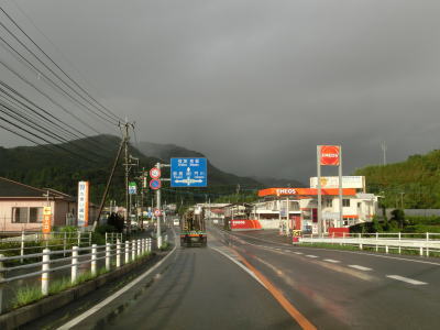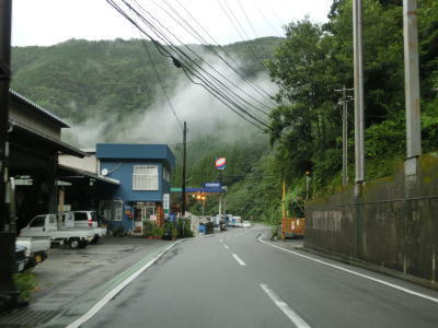 | 虹の大橋を渡って耳川に沿って右にカーブすると古川集落を通過する。沿線にある建物は少ないが諸塚村(と言うより宮崎県の山間部)では貴重な廃業していないガソリンスタンドがある。その後も耳川に沿って2車線道路を走る。川が町村境のため対岸は美郷町域である。 | ||
