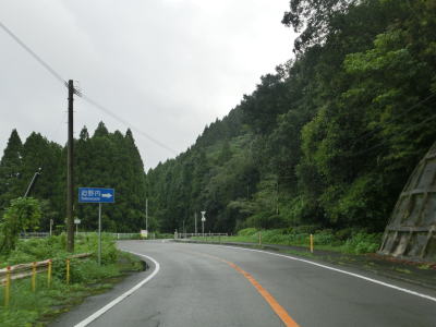 | 町道215号との交差点の手前に50km/hの制限速度の標識が設置されているが、その下の補助標識に「ここから 横断者注意」と書かれている。50km/hの制限速度の区間内全てにおいて横断者に注意せよという意味だろうか。 坂本集落を通過し、耳川の右岸を走っていると西郷ダムの横を通過する。大内原ダムと同様にダム湖が形成されているが、ダイナミックさに欠ける形状である。笹陰ダム湖畔を走っていると町道551号との交差点を通過する。町道との交差点のすぐ先に笹陰林道が交差しており、林道を進むとおせりの滝やキャンプ場に行く事ができる。 |