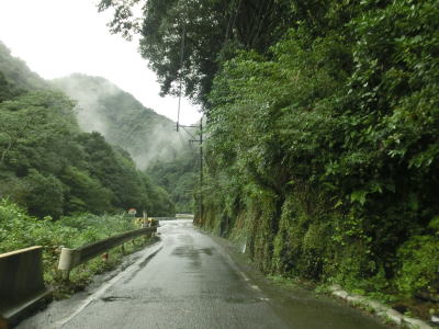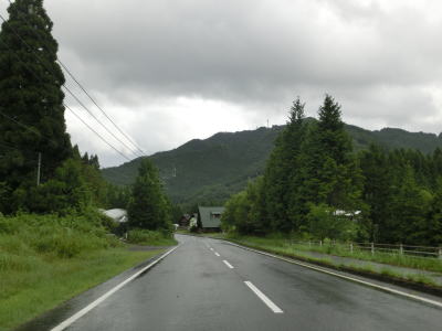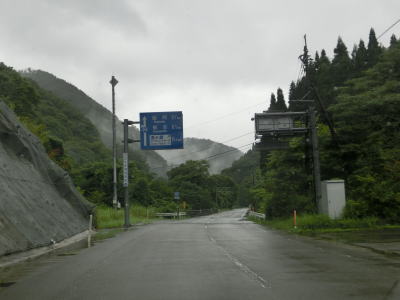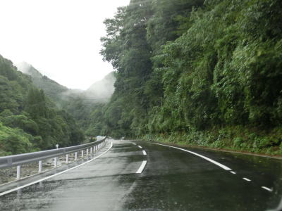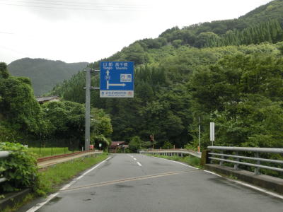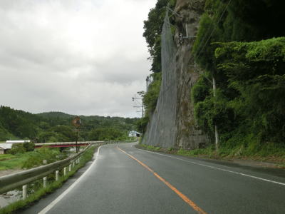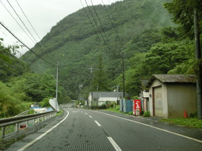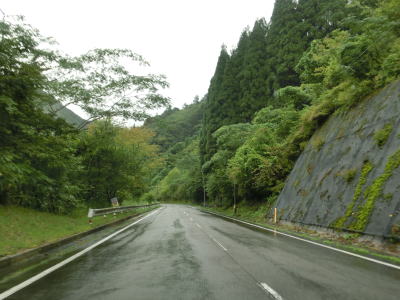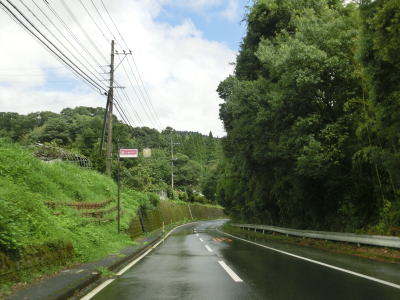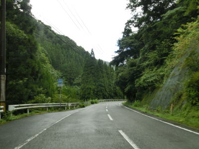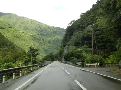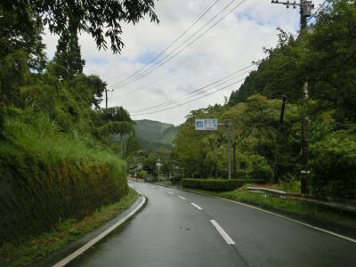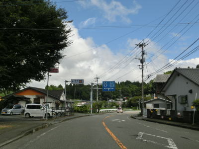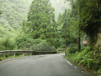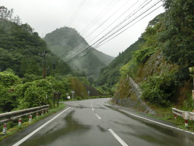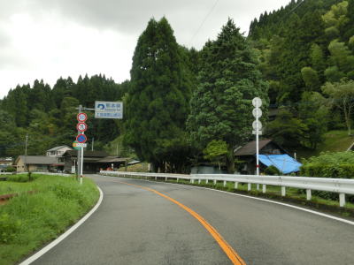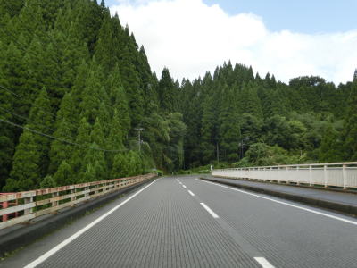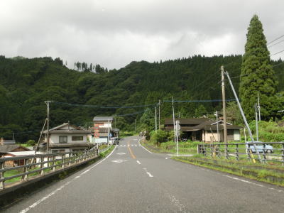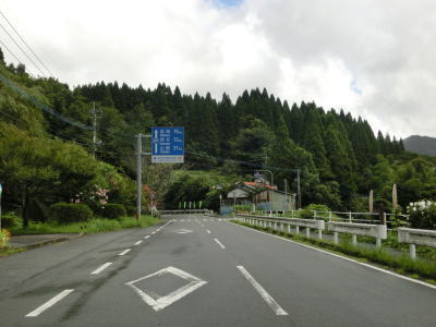 | 下り勾配の2車線道路を快走していると本屋敷集落を通り抜ける。集落の中ほどには五ヶ瀬ハイランドスキー場への町道との交差点があり、7km先にあるスキー場は日本最南端の天然雪のスキー場らしい。本屋敷集落を過ぎてからも下り勾配の2車線道路を淡々と走る。道路状況に比して交通量は少ない。 | ||
