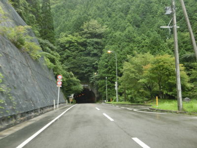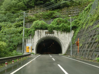 | 村道との交差点を通過した直後に国見トンネルに入る。国見トンネルは全長2777mという距離はR327のみならずR265でも最長(2018年8月現在)であり、山岳狭路酷道だった国見峠を容易に越えられるようになった。 トンネルからは五ヶ瀬町に入り、峠を越えるため下り勾配となる。案内標識には延岡と熊本が表記されており、直近の五ヶ瀬町市街や山都町は記されていない。この場所を北上して延岡や熊本に行くという需要があるのだろうかと思ってしまう。 |