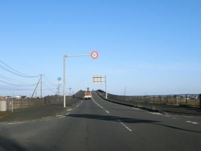 | 跨線橋を過ぎて平坦な道路を走っていると鹿児島r373交差点を通過する。直後に鹿児島r372交差点を2ヶ所通過しているが、東に延びている方は案内標域どころかソトバも設置されておらず、県道との交差点には見え難い。出水市陸上競技場の西を通り過ぎて少し走ると緩やかな下り勾配となる。 | ||