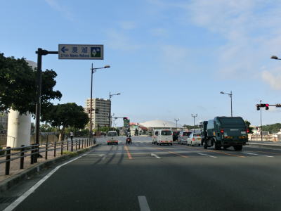 | 壺川駅を通過してすぐに沖縄r221の跨道橋も新那覇大橋への勾配を上り、ゆいレールは南に逸れてr221那覇大橋に沿って国場川を渡る。R329も緩やかなS字状のカーブを描きながら新那覇大橋で国場川を渡る。新那覇大橋からの左カーブを曲がると豊見城市に入り、その直後でとよに大橋を渡る。この橋の下にあるのが漫湖である。 | ||