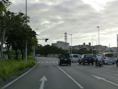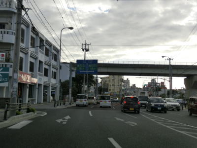 | 沖縄市に入ってからは車線数や交通量に変化はないがアップダウンを繰り返すようになる。勾配は緩やかなので走りにくくなるという程ではないが、沖縄r85比屋根交差点交差点の手前の勾配はややきつい。このr85は中央分離帯を持つ片側2車線道路で右折もしくは左折してr85に進む車両も少なくない。特に右折する車両が多く交差点は渋滞していた。その比屋根交差点のすぐ北には沖縄r22高原南交差点が近接している。 | ||