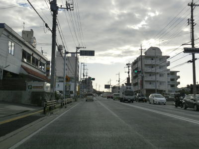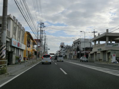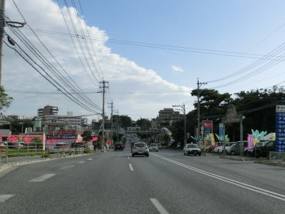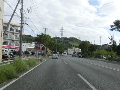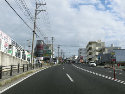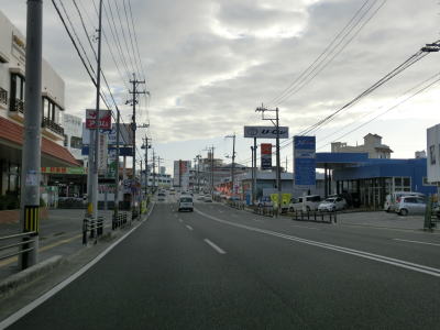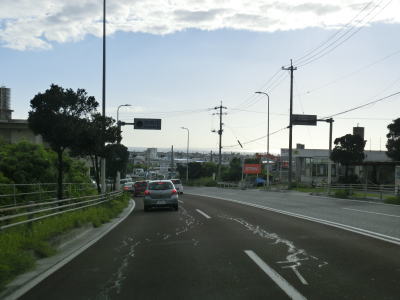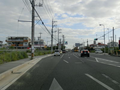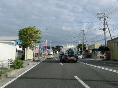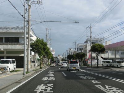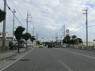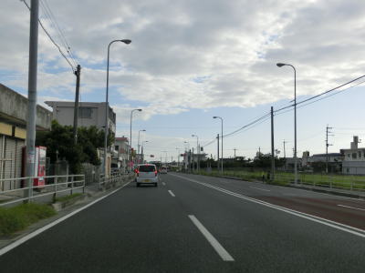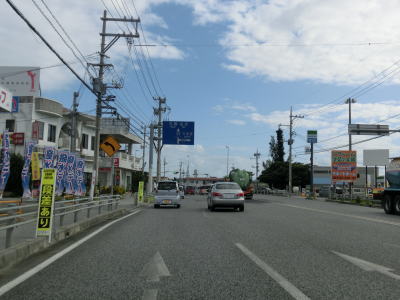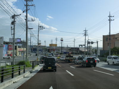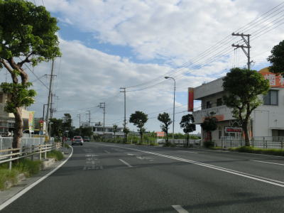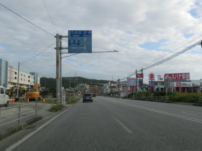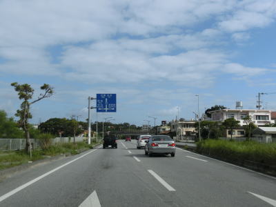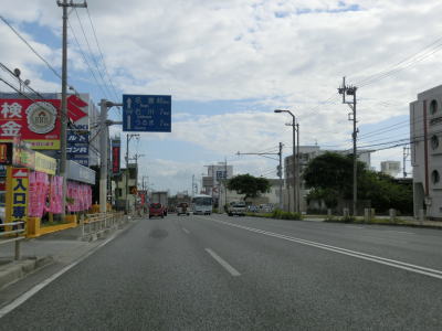 | 上間交差点からは道路グレードが少し落ちて中央分離帯のない4車線道路になる。緩やかな右カーブを曲がって左にカーブする手前で市町境を通過して南風原町に入る。県庁所在地から町に入ったからと言って道路状況や周辺の様子、交通量に変化はなく、幹線道路として機能している4車線道路を走る。細かなカーブは多いが勾配はほとんどなく平坦である。 | ||