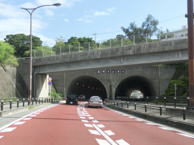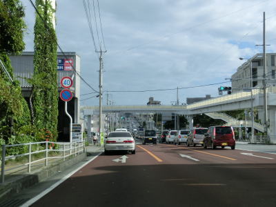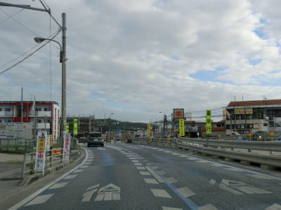 | 与那原バイパスとの交差点の直後に町境を越えて西原町に入る。南風原を“はえばる”、与那原を“よなばる”と読む事から西原を“にしばる”と呼んでしまいそうだが、“にしはら”とごく普通の読み方である。そんな西原町に入ってからも道路状況は変わらず、右折車線のない4車線道路が続いている。小波津川に架かる小波津川橋は架け替え工事が行われていたため、上下線で別々の仮設橋を渡らなければならず、橋の前後に急カーブがある。 | ||