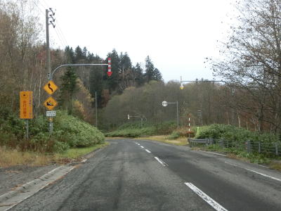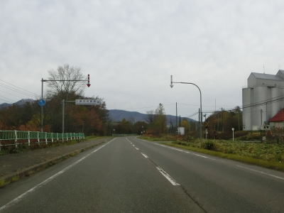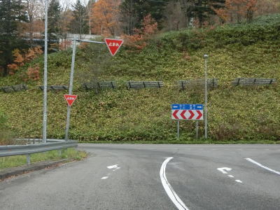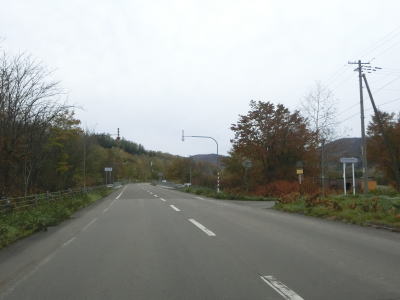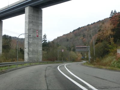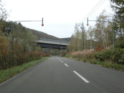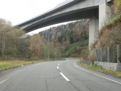 | 留辺志部川の左岸を走っていると滝口橋で川を渡ってきたE39/R450旭川紋別道の滝口跨道橋をくぐる。その手前は直線道路となっており、東向き車線のみ自動速度取締機が設置されている。 | ||