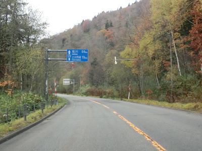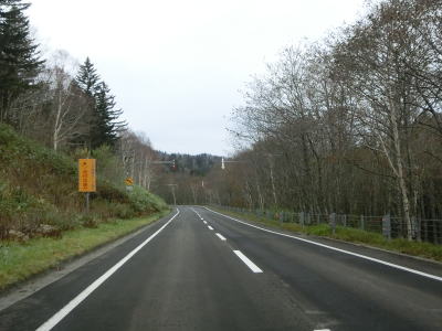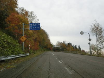 | 小刻みなカーブが連続している2車線道路を走る。左にカーブしてE39/R450旭川紋別道の北大雪トンネルの上を通り、曲線半径40mの右カーブを曲がる。旭川紋別道の清澄橋の南で左にカーブした後に6%の勾配を下る。その前方には旭川紋別道の美水橋が見える。 | ||