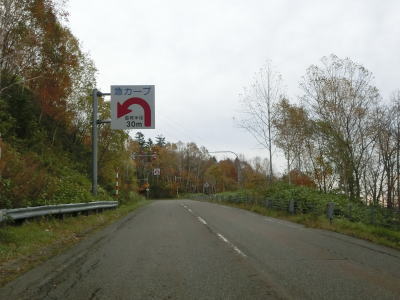 | 登坂車線が終わった直後に左ヘアピンカーブを曲がる。曲線半径は30mとかなり急だがセンターライン付きの2車線道路なので酷道と言える程ではない。ヘアピンカーブの先には丘平覆道をくぐるが、その延長は400mと覆道にしては長い。覆道を出た直後は曲線半径40mの右ヘアピンカーブが待ち構えている。E39/R450旭川紋別道の北大雪トンネルの上を通過した先の左ヘアピンカーブの曲線半径は30mである。 | ||