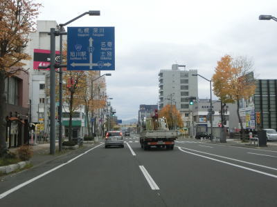 | 牛朱別川に架かる境橋を渡ってすぐに北海道r140 9条通18交差点を通過するが、こちらはバイパスと思われる。交通量の多い4車線道路を走っていると市道との4条通19交差点を右折して深川・旭川駅方面に進む。 | ||
