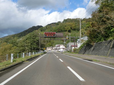 | 羅臼ビジターセンターからすぐの場所に通行に関するお知らせを表示する標識が立っているが、それによると斜里町宇登呂までの23.8kmの区間は異常気象時には通行止になる事が分かる。通行可能時間帯は9:00〜16:00となっている点が気になるが、剥がれかけたガムテープがあるので時間帯通行規制は解消されている可能性がある。なお、この区間は冬季閉鎖区間でもある。沿線に建物のない状態を上って行くが、羅臼川に沿っている間の勾配はさほど急ではない。 | ||