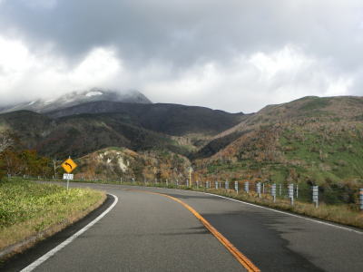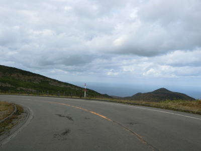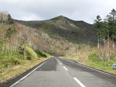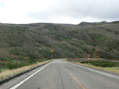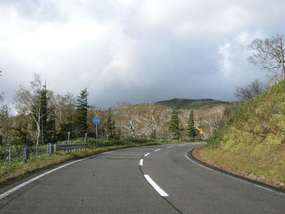| 標高600m付近はカーブが落ち着いた道路状況となっているが、車を進めるとまたしても急カーブが連続する状態になる。右の急カーブを曲がって見返り峠を越えるが、その名が示す通り、峠の手前は南から東にかけての眺望が非常に良い。見返り峠からは再び羅臼岳が正面方向に見えるようになる。 | ||