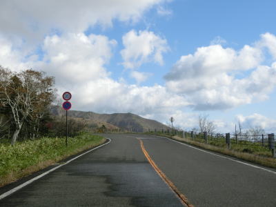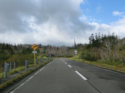 | 左ヘアピンカーブを曲がり終えるとセンターラインが白破線に変わり、程なくして制限速度は40km/hとなる。しばらくカーブのない状態となるが、左にカーブの先で右ヘアピンカーブを曲がる。その後は正面方向に羅臼岳を望む状況になるが、残念ながら中腹より上に雲がかかっていた。5合目の左カーブを曲がって羅臼岳に背を向ける方向に進む。 | ||