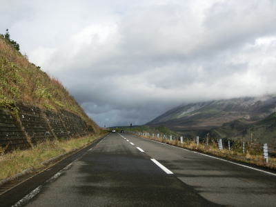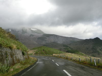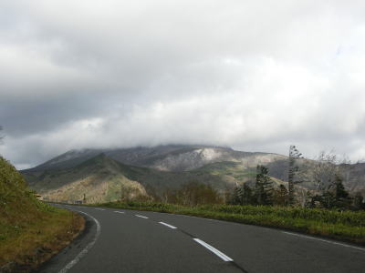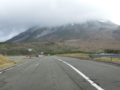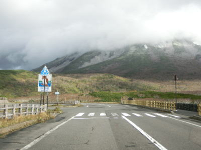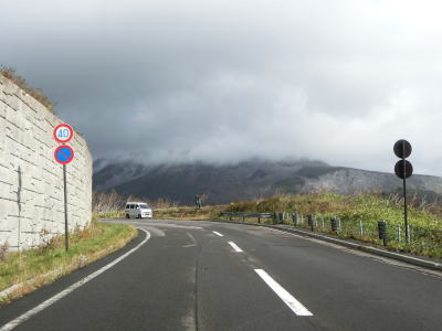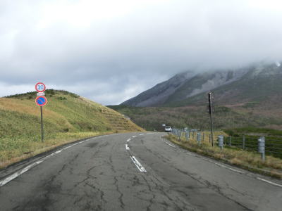 | 知床峠の三合目を越えると急カーブが増える。正面に羅臼岳を望む箇所もあるが、走行した日は雨が上がった直後だったため山頂部分に雲がかかっていた。30km/hとさらに制限速度が下がり、複数のヘアピンカーブを連続で曲がる。 | ||