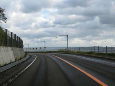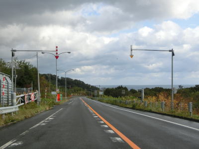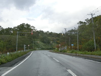 | 峯浜駐車場を通り過ぎると左にカーブして海岸線から離れ、勾配を上っていると閉鎖用ゲートを通過する。ここにも転回用のスペースは設置されていない。海岸線からさほど離れていないのに海の見えない2車線道路を走っていると反対側の南向き車線にだけゆずり車線が設置されている。 | ||