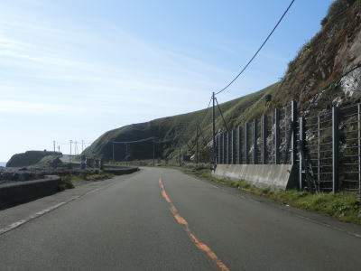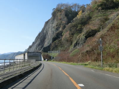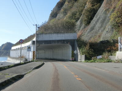 | 2ヶ所目の道路通行規制区間の起点の閉鎖用ゲートの直後に音調津覆道に入り、その直後にモイケシ第一覆道を通る。フンベ第1覆道と同様に第一はあるが第二は存在していない。海沿いの数軒の家屋のみのモエケシ集落を通り抜ける。 | ||
