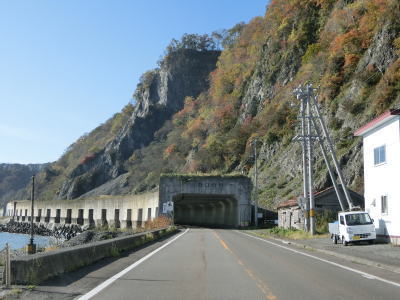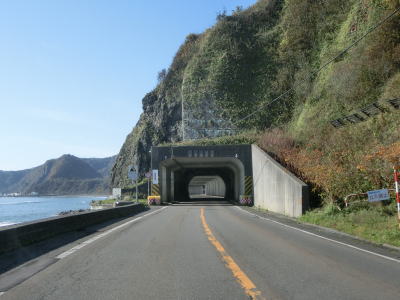 | フンベ隧道をくぐるが、その前後にはトンネル本体よりも長い覆道が接続している。次いでフンベ第1覆道をくぐるが、第2覆道は撤去されたか第1覆道に取り込まれたかで現存しない。フンベ第1覆道を出ると美幌集落を通る。駐車できるスペースが点在しているが、サーファーのものと思われる車両が停まっていた。 | ||