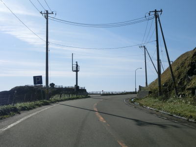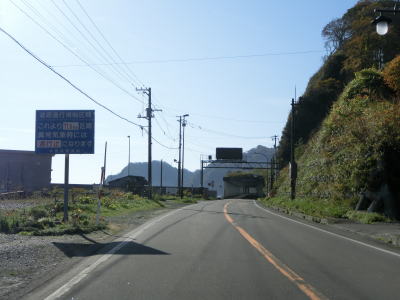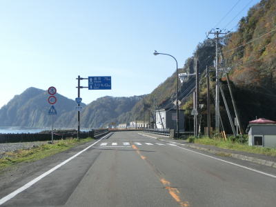 | 新宝浜トンネルを出てすぐに非常電話のある駐車帯の前を通り、日勝橋を渡ってえりも町に入り、その南詰で閉鎖用ゲートを通過する。音調津集落から7km程度しか離れていないため段階的に規制を架けるために設けられたゲートと思われる。日勝橋は“日高”と“十勝”から取っている思われ、十勝総合振興局と日高振興局の境でもある。小規模な目黒集落を通り抜けると目黒トンネルに入るが、海寄りには岬第一覆道が見える。目黒トンネルの供用は2012年であり、旧道は閉鎖されており通行できない。 | ||