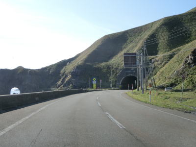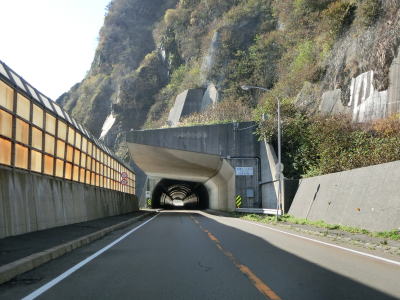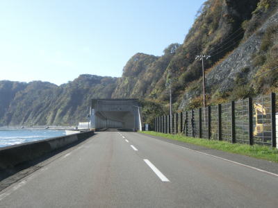 | 猿留橋から緩やかなカーブの先でえりも黄金トンネルに入る。その全長は4941mと道路のトンネルとしては北海道で最長である。既にあった宇遠別トンネルに接続する形でトンネルが掘削されたものである。接続箇所は視認できないが、照明が異なるため判別可能である(宇遠別トンネルはナトリウム灯で新設部分は蛍光灯)。海沿いに旧道が存在しているが、関係者(おそらく漁業関連と思われる)以外は通行できないし、崩落などによって物理的に通行できない箇所もあるだろう。 えりも黄金トンネルを出てすぐに次の咲梅トンネルに入り、次いで白浜トンネルをくぐる。どのトンネルの坑口傍にも旧道が接続しており、覆道なりトンネルなりが見えている。 |