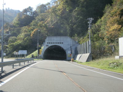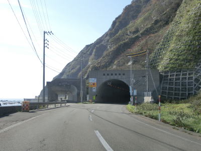 | モイケシ覆道を通り抜けた先でタニイソトンネルに入る。2005年に竣工したトンネルで全長は2020mと長大である。トンネル坑口の海寄りには別のトンネルが見えるが、これは重蔵隧道である。一見すると坑口の手前のゲートが解放されており通行できそうだが、トンネルの南が閉鎖されているため通り抜けは不可能である。タニイソトンネルの南側坑口のすぐ傍には旧道の黄金トンネルの坑口が確認できる。黄金道路と同じ名称のトンネルながらその延長はさほど長くない。他にも旧道には複数のトンネルや覆道があったが、前述の通り通行する事はできない。 タニイソトンネルを出てすぐに次の新宝浜トンネルに入る。こちらは2016年に供用されており延長は2438mとこれまた長大なトンネルである。手前に旧道が接続しているが、立入り禁止の看板が設置されており漁業関係者などの一部にしか開放されていないようである。なお、このトンネルの旧道にも複数のトンネルや覆道が存在していた。 |