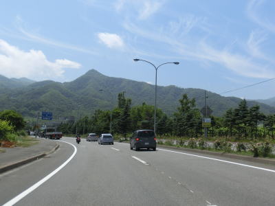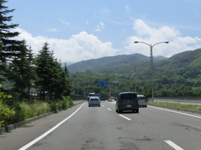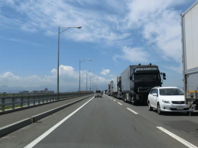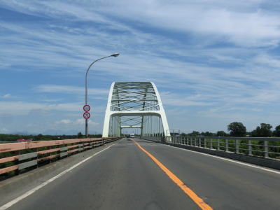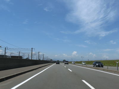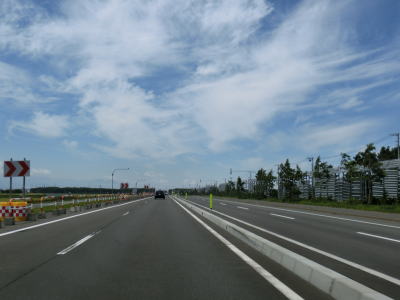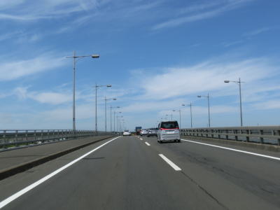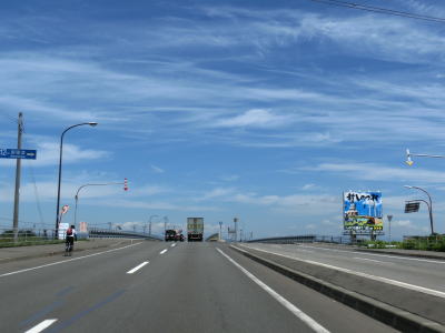 | 右カーブを通り過ぎてから花畔大橋で真薫別川を渡る。右側車線が工事のため通行できなかったが、本来は片側3車線であり、橋を渡り終えた所で花畔ICとなり左側車線がそのままR231として側道への車線になる。花畔IC以降は片側2車線となるが交通量は多いままである。 | ||