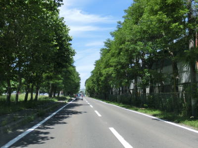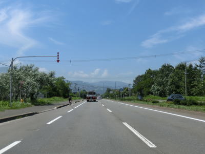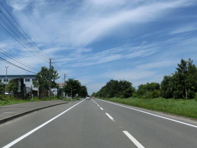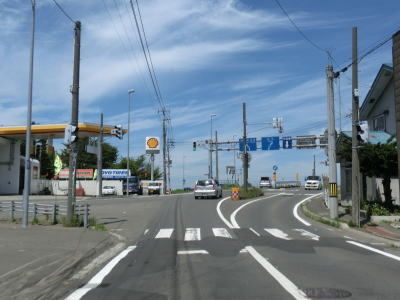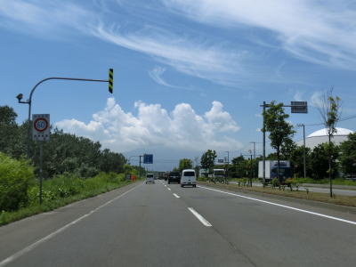 | 緑町交差点からは再び石狩川の左岸を走る。川の反対の左側は工業団地となっており普通の家屋は見られず大きな建物が並んでいる。王子交差点から約4.3km、緩やかなS字カーブの先でR275角山交差点に突き当たる。案内標識に表記されている通り、右折してR275との重複区間に入る。 | ||