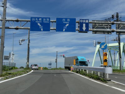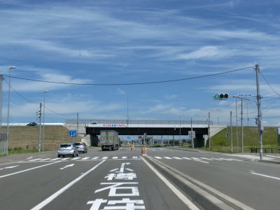 | 2車線になったものの道路の左側には拡幅用地と思われる空き地があり、一部は工事が行われている様子だった。緩やかな勾配の跨線橋でJR学園都市線をオーバーパスし、北海道r112交差点を通過する。反対側の車線はこのr112交差点を先頭に渋滞しており、車列は札幌大橋を越えてr112あいの里4-8交差点の先まで延びていた。その札幌大橋を渡ると札幌市に入るが、北端を掠める程度しか札幌市内を走っていない。 | ||