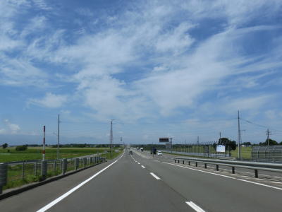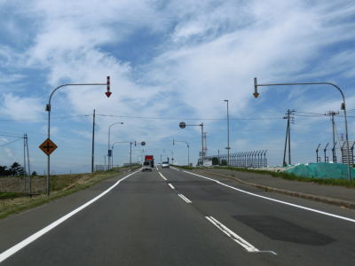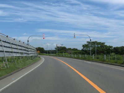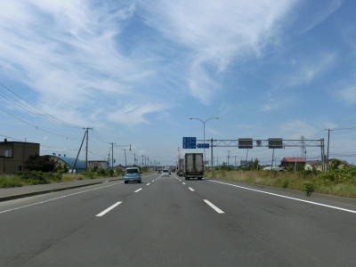 | 角山交差点からすぐに石狩川を新石狩大橋で渡る。“新”と付いているからには旧橋が架け替えられたのだろうが、歩道がなく大型車を始めとして交通量が多いため歩行者や自転車は危険かもしれない。新石狩大橋を渡り終わると左にカーブしながら快走路を走る。西側には防雪柵が設けられているが、東北地方に比べると意外にも防雪柵の設置は少ない。篠津運河の手前で車線が増えて片側2車線になりすぐ先で当別町に入る。 | ||
