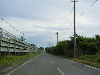 | 青森r10交差点を過ぎてすぐに四川目橋を渡って四川目ふるさと広場の前を通る。沿線は家屋ではなく畑が広がっているため西側には防雪柵が設置されている。淋代集落に入ると防雪柵は設置されていないが、沿線に家屋が建っている。 | ||