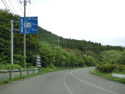 | 104.「78km仏ヶ浦 29km恐山霊場」 | 105.「大間67km 恐山32km むつ17km」 | 106.旧道(?)が交差している右カーブを曲がる |