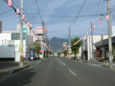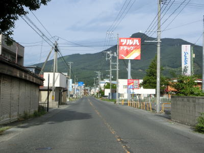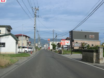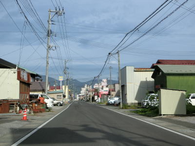 | 青森r4交差点以西も2車線道路が続いており、沿線には個人商店が建ち並んでいる。両側の電柱に飾られている提灯は大湊ねぶた祭のものだろうか。むつ総合病院の南西の交差点を過ぎると道路状況が良くなる。右斜め前方に延びる道路が旧道と思われる。 | ||