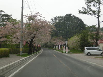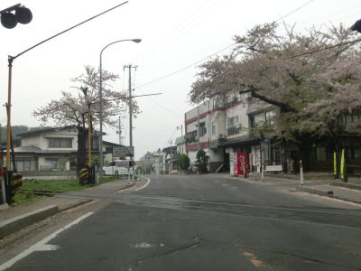 | 旧金木町の中心部の北で芦野公園に差し掛かり左急カーブを曲がる。園内には多くの桜の木があり、ゴールデンウィークの時期には金木桜まつりが開催される。走行した日は散り始めであった。公園を出る直前には津軽鉄道の芦野国道踏切があり、以降は家屋が建ち並ぶ間を走る。やや急な右カーブからは藤枝溜池の西を走っているが、この溜池は芦野湖とも呼ばれ、芦野公園に含まれている。 | ||
